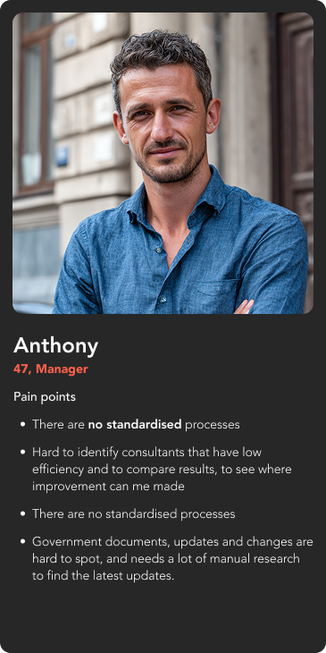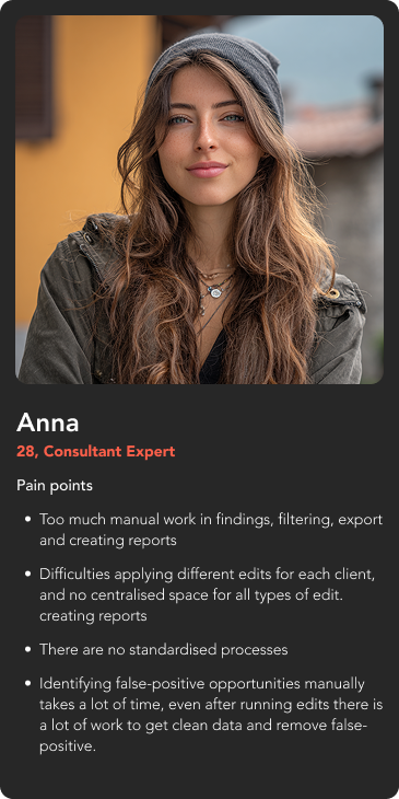 As a part of discovery phase, I conducted a session of 9 separate interviews with actual users that will use the product, to understand the general pain points, needs, current workflows, current problems and expectations from the product.