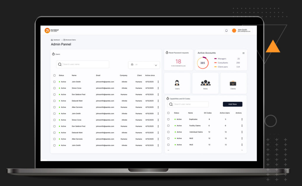The admin panel allows an administrator to manage users efficiently. Within the panel, the admin can add new users, remove existing ones, and view which users are currently active. The admin can also check for password reset requests and generate reports that break down the number of active accounts, categorizing them by managers, consultants, and clients. Furthermore, the admin can assign new roles, add new clients, and configure various capabilities for each user.